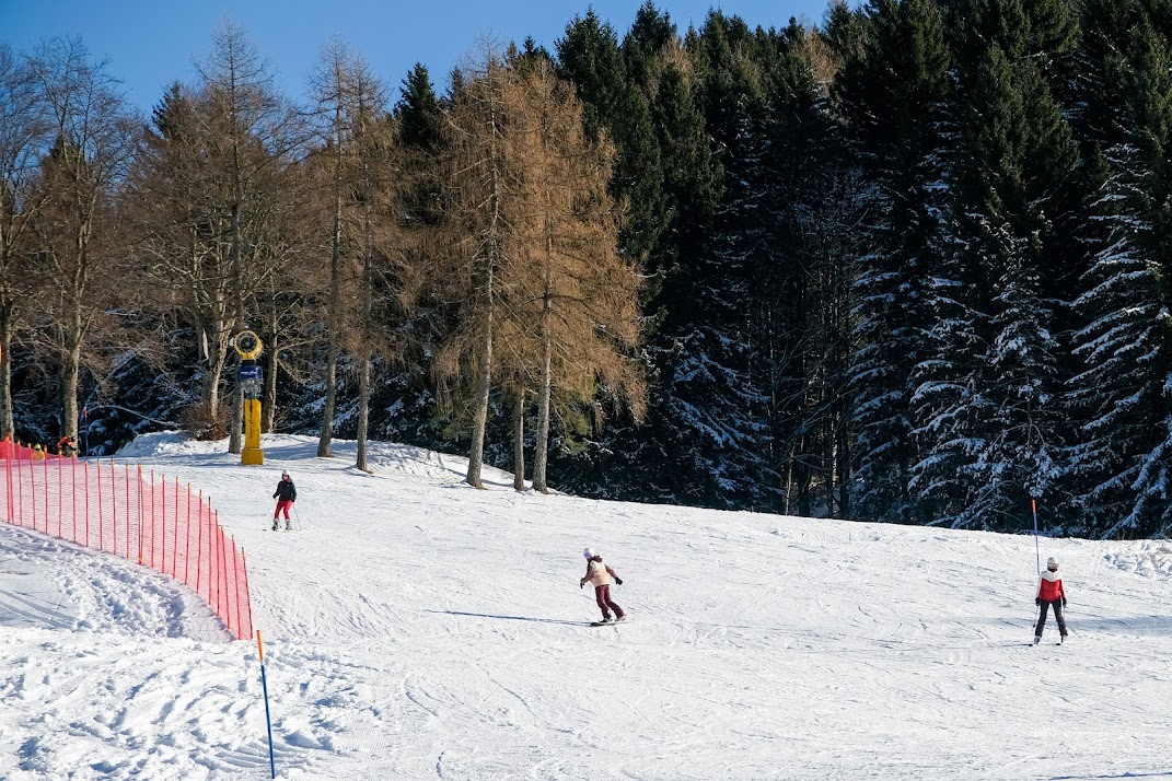 Możemy stąd ruszyć w dół i na rozjeździe w lewo czerwoną trasą nr 6 do Francolini (od sezonu 2026 będzie stamtąd startować nowoczesna gondola) albo czerwoną i potem niebieską 9 do Fondo Grande. To kolejny ośrodek narciarski działający w ramach Alpe Cimbra z którego startuje kilka wyciągów i który otwiera przed nami dziesiątki kilometrów tras, w tym słynną czarną Martinellę. Ale dziś skupiamy się na stokach dla początkujących i średnio zaawansowanych, więc z Sommo Alto jedziemy bardzo przyjemną trasą 5 Stella d’Italia (1620 m, niebieska). Tuż przed schroniskiem Stella d’Italia na rozjeździe skręcamy w prawo. Tu czeka nas nieco bardziej stroma ale szeroka ścianka i dalej łatwa trasa, na której mamy dwie opcje. Po dojeździe do dolnej stacji zainstalowanej między stokami kolejki typu magic carpet możemy pojechać stokiem w prawo – wówczas niebieską trasą zjedziemy do Ortesino. Albo pojechać wyciągiem taśmowym w górę i dalej niebieską 1b. I znowu – albo w prawo niebieską 1c do Ortesino, albo prosto 1b przez las do Costy.