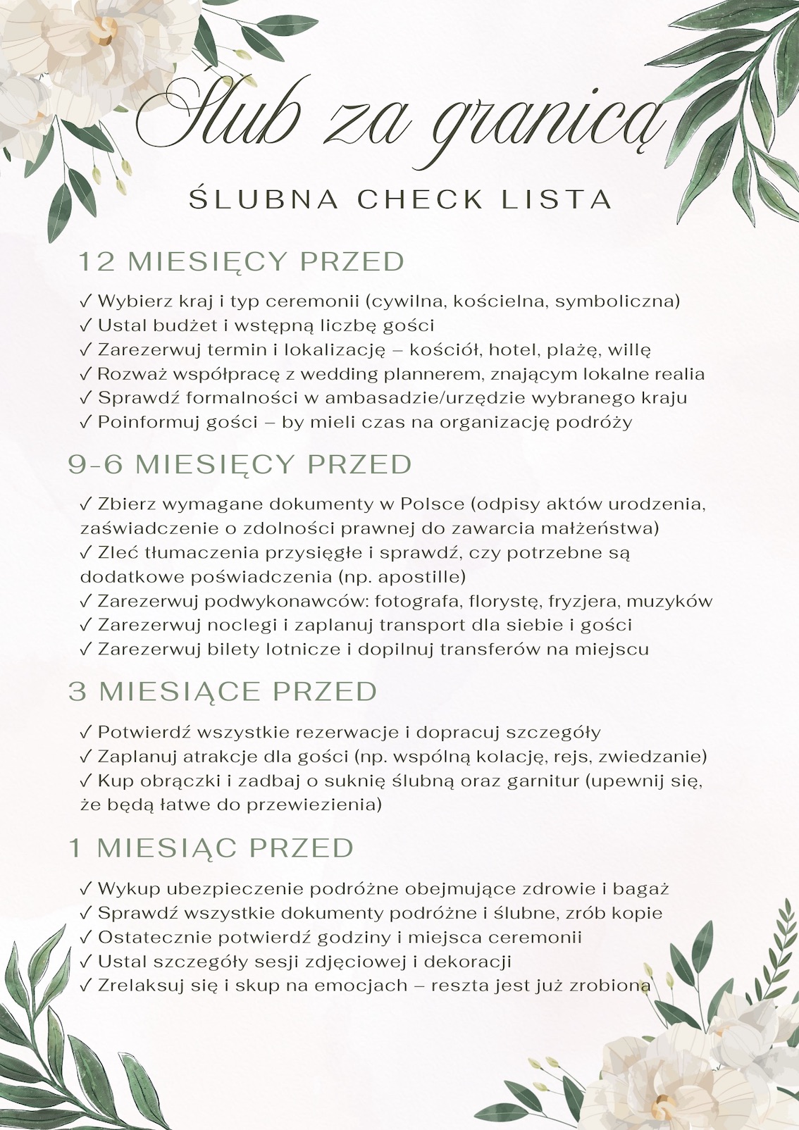 Oczywiście trzeba tę decyzję przemyśleć. Bo choć ślub za granicą wydaje się kuszącą perspektywą, to jednak wymaga dobrego planowania i znajomości formalności. W praktyce organizacja ślubu poza granicami kraju różni się w zależności od wybranego kierunku i rodzaju ceremonii. Jak więc krok po kroku przygotować się do takiego wydarzenia, aby uniknąć stresu i nieprzewidzianych problemów?